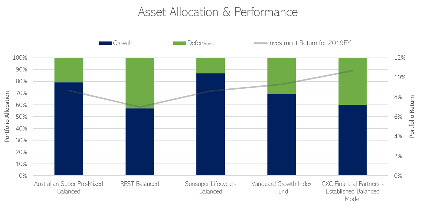 The below performance and asset allocation figures were obtained from the website of the relevant fund provider. The figures relating to the Satori Advisory portfolio were obtained from an actual client portfolio who was fully invested in the model portfolio over the full financial year. All performance fees are net of investment fees.