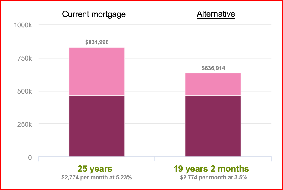 The graph below shows that keeping your payments the same whilst reducing your interest rate from 5.23% to 3.5% will shave 6 years and save almost $200,000 in interest. Imagine the difference if your mortgage is greater than $462,000